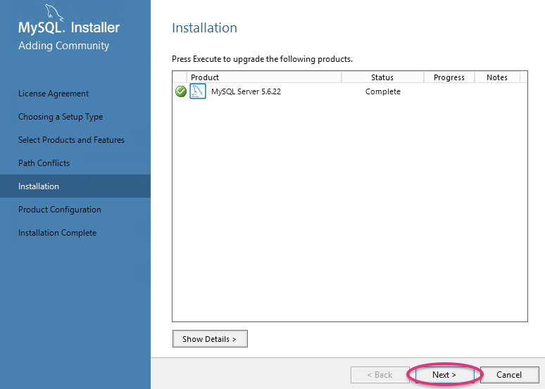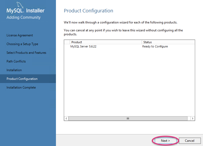 最小構成は MySQL Servers/MySQL Server/MySQL Server 5.x/MySQL Server 6.x.xx - X64 だけを選択し、「Next」を押下します。