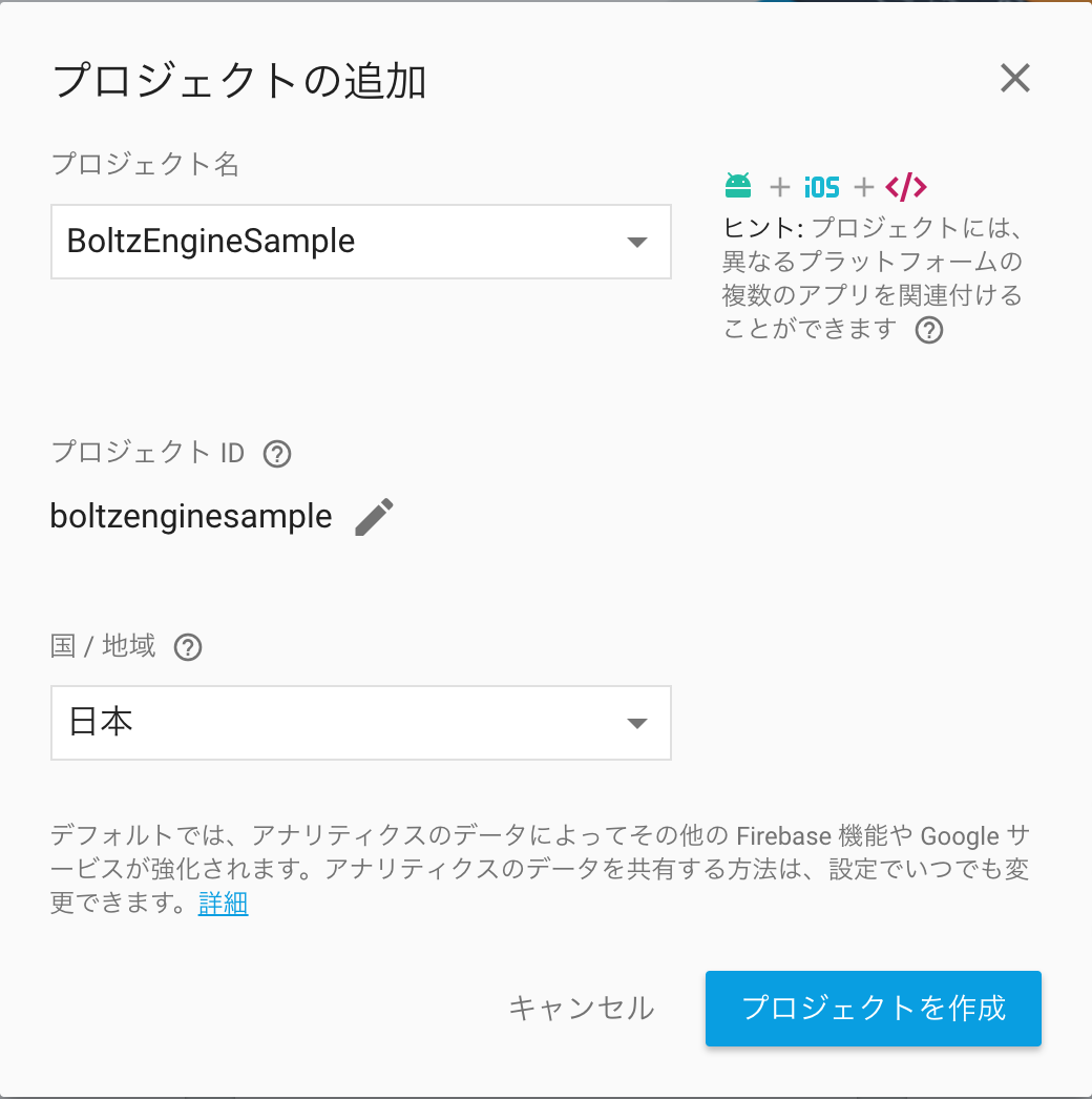 [プロジェクト名]は任意の名前を、[国・地域]は作成する個人・団体が所属する国・地域を選択します。
