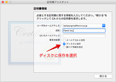 開いたウィンドウでウィザードを進めると、証明書発行要求のダイアログが表示されます。下記の通り入力します。